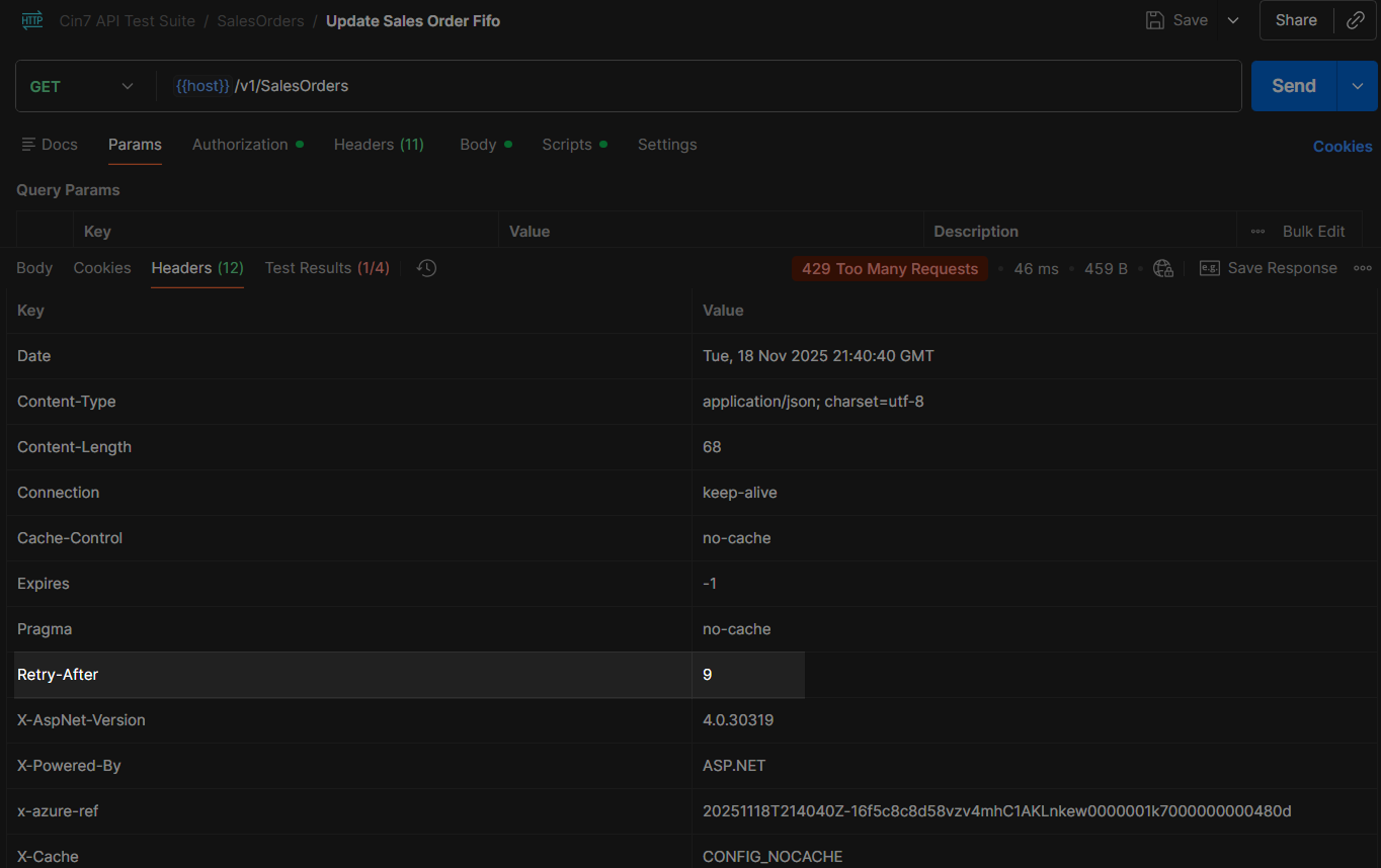 When you exceed the Cin7 Omni API rate limit, you will receive the 429 Too Many Requests error. You can check the response header for the Retry-After time period (in seconds). Your API request will work if you try again after that period of time.