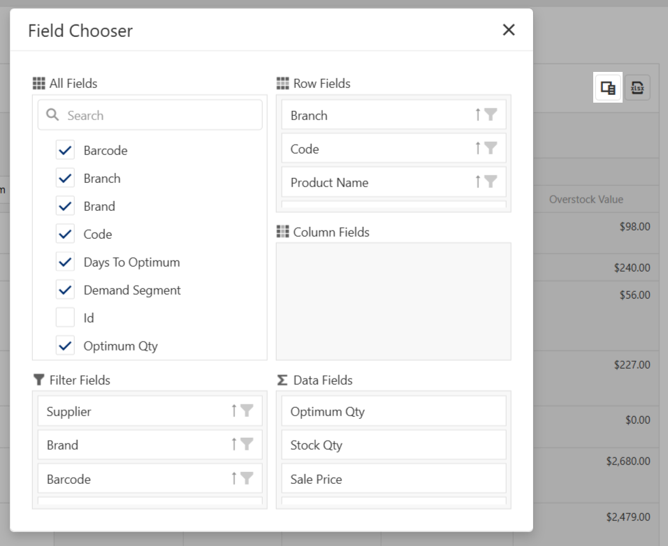 You can drag columns to add more fields to the report or change the layout of the report. Cin7 Omni reports use a pivot grid. Alternatively, you can use the Field Chooser to filter results, remove fields, and change the layout.
