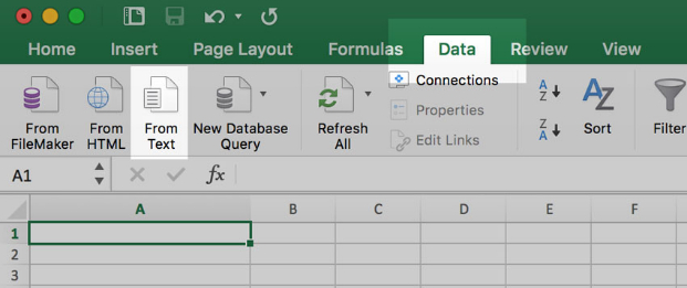 Open a blank document, select the Data tab, and then click From Text to initiate the From Text wizard.
