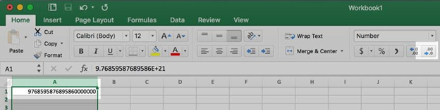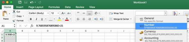 Microsoft Excel often abbreviates long numbers using "Floating-point arithmetic". It will turn a long number such as a barcode into a shorter number, like this '9.7686E+21'. While useful for mathematicians, it's less so for presenting long strings of numbers such as barcodes or phone numbers.