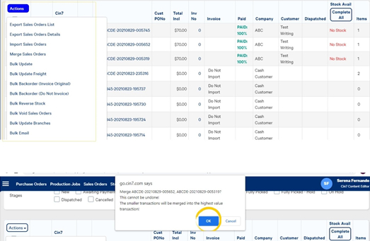 From the Actions menu, select Merge Sales Orders, select OK to the pop up message. You will be directed to the Edit Sales Order page.