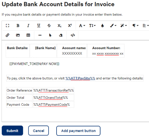 Updating your bank account details section with a payment button will add it to all of your invoices. Click on Add payment button.