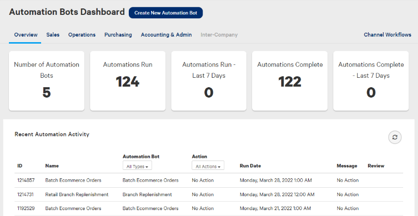 The Automation Bots Dashboard provides an overview and a history of the automation bots running.