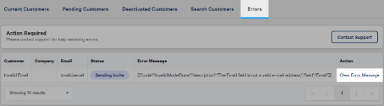 Errors can appear when there are issues with inviting a customer (for example, an invalid email address). These display on the errors tab. The errors tab will only appear if you have errors.