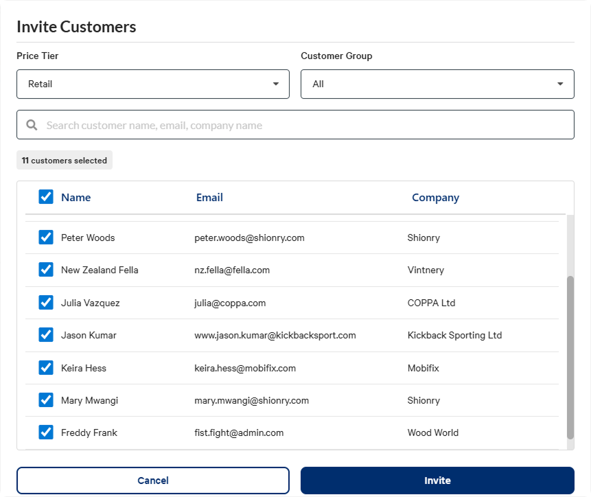 Select your customers in the list or search for a specific customer. Customers need to be created in the CRM before they can be invited to your B2B online store. You can filter your customers by their Price Tier or by their Customer Group.