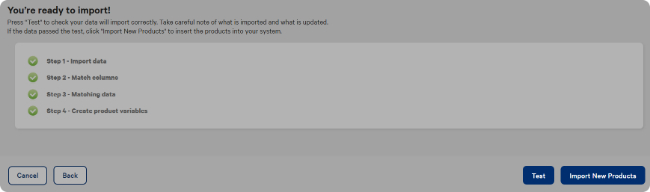 A green success message will display to inform that the product import process was successful. If there are any issues with the import, an error message will appear. Make the changes to your import before testing again.