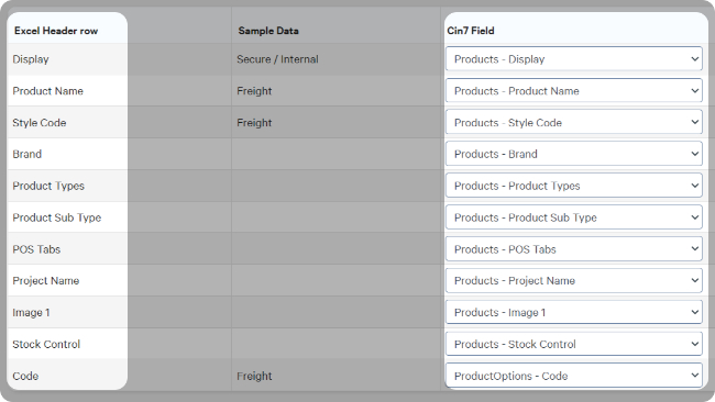 Cin7 Omni will suggest fields that match your spreadsheet columns.