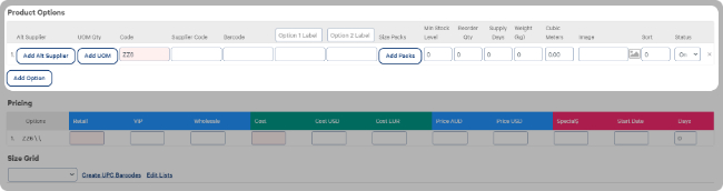 Select Group by Code to update product options fields. You can't update existing product option codes, but you can create new codes.