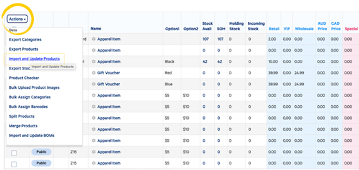 Hover over the Actions button and then Import and Update Products.