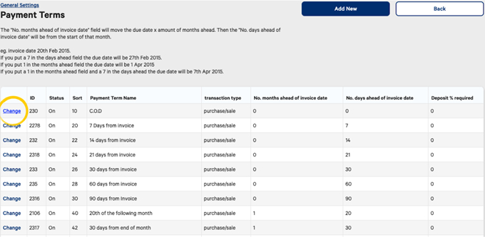 To edit or switch on or off an existing payment term, select Change.