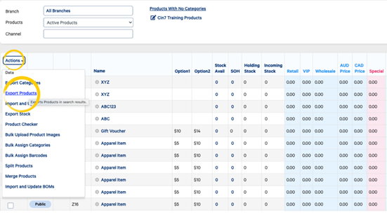 From the Products module, hover over the Actions button and select Export Products.