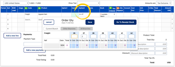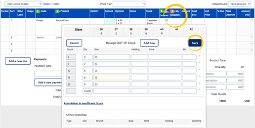 Fashion products often have multiple colors and multiple sizes. Cin7 Omni's size color grid allows for the speedy entry of fashion products into an order by removing the need to add a new line item for each color and size.