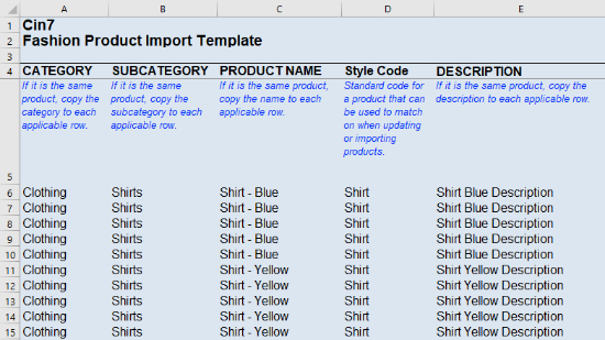 Download the template for importing products. This will not import fashion products or products with alternative units of measure.