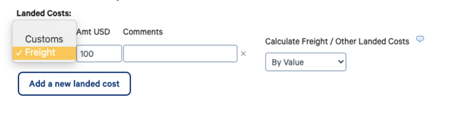 Under the Landed Cost section, use the dropdown box to select the type of Import Cost you want to be added as a part of the landed cost