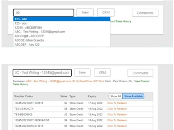 The customer will be added to the transaction, and details of gift vouchers, credit notes, and transaction history will appear below.