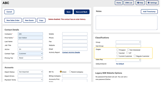 In the Classifications area, to the right of the screen, select the Stages you want to apply to the contact.