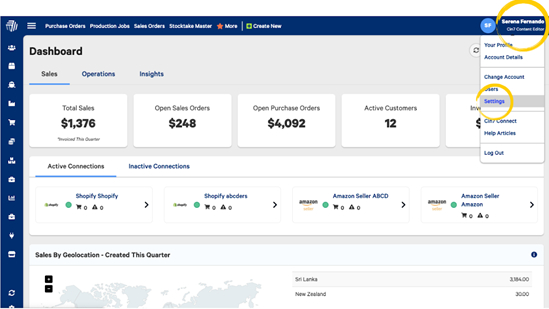 While logged in as an Administrator, select your username in the top right of the screen and then select Settings