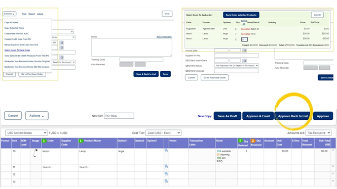 Select Approve Back to List to confirm the order.