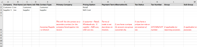 Enter Company, First Name, and Contact Type (customer or supplier) for each contact. These fields are required for a contact to be created in the CRM.