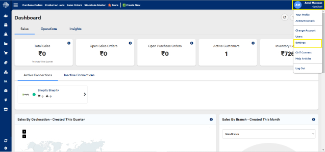 1. While logged in as an Administrator, select your username in the top right and then select Settings.