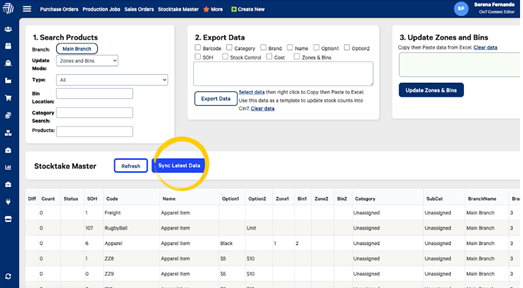 In the stocktake master module in the Backend, select Sync Latest Data which will pull the data from the mobile stocktake to the Stocktake Master module.