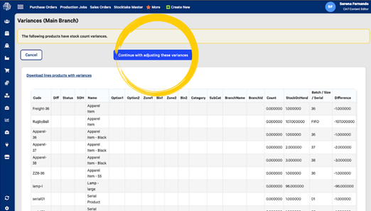 Select 'Continue without not counted products' and you will be given a summary of the differences.