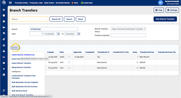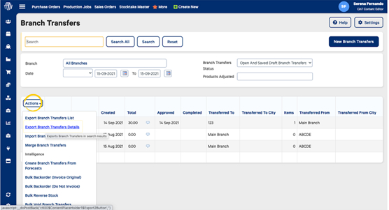 From the Branch Transfers List page, hover over Actions then select Export Branch Transfers Details.