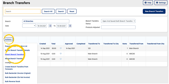 While in the Branch Transfer list page, hover over Actions, then Import Branch Transfers.