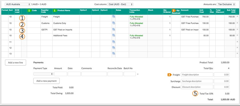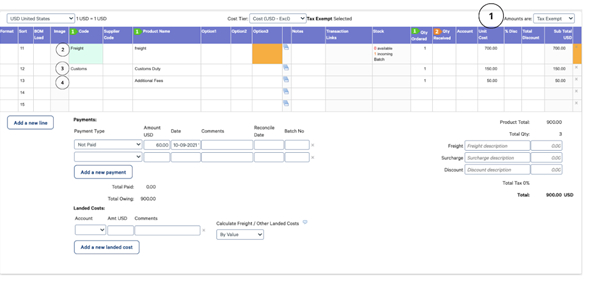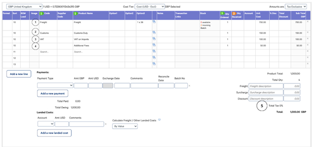 Purchases for Freight and Customs Duty must be entered correctly in order to calculate landed costs, and also to ensure that the correct tax is applied when importing to your Accounting Software.