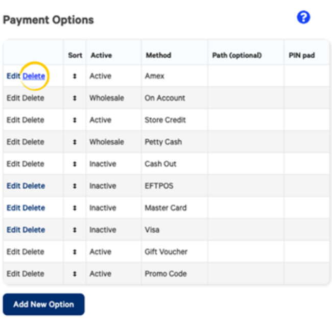 Next to a Payment Option, select Delete