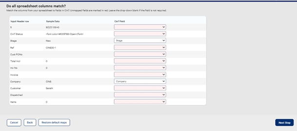 An example from your spreadsheet is provided for your information.If any products or contacts in your list do not match to entries in Cin7 Omni, then you will be given an opportunity to download the spreadsheet so that you can investigate, and if need be import new products or contacts.
