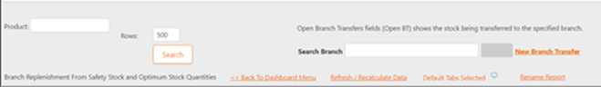 The report will show the Stock on Hand in the current branch as well as the Safety Stock and Optimal stock levels. If the Stock on hand quantity is less than the Safety stock then the To Order column will show the quantity required to bring the Stock on Hand back to the Optimal level.
