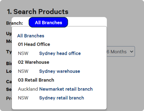 Under Search Products, select a Branch. You can only update products in one branch at a time.
