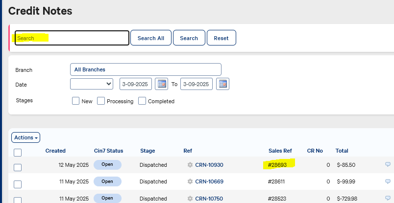 Add Sales Ref to Credit Note Search field options